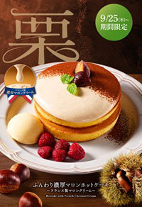 秋の味覚”栗”を贅沢に味わえる季節限定スイーツ。特製マロンクリームは、ペースト状の濃厚なマロンクリームと、甘さ控えめで軽やかなホイップクリームを混ぜ合わせ、ふんわりとした口当たりとなめらかな舌触りを実現。栗本来の風味と甘さを引き出すために、隠し味のバニラエッセンスを加え、焼きたてのホットケーキにのせても溶けにくいよう、やわらかさにもこだわっています。仕上げにふりかけたココアパウダーが、マロンのやさしい甘さを包み込み、ほろ苦い風味で全体を引き立てます。香り高く濃厚なマロンクリームと、ラズベリーの酸味の相性をお楽しみください。